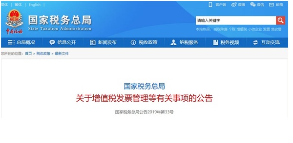 國家稅務總局關于增值稅發(fā)票管理等有關事項的公告國家稅務總局公告 2019年第33號